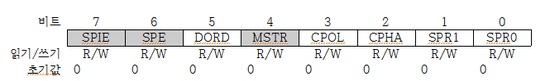 여기서 SPIE, SPE, MSTR 비트를 설정하여 통신을 한다.